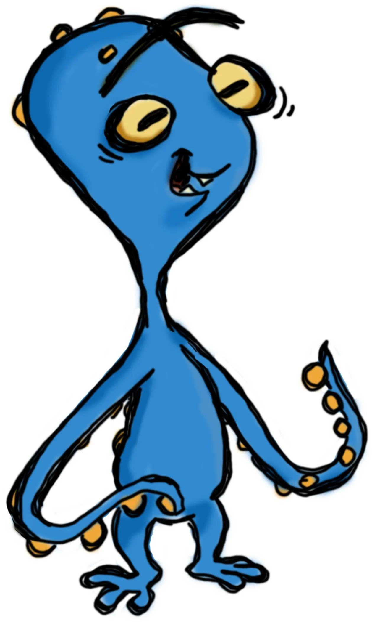Originally, Armstrong was essentially a weird mutant creature that was meant to be designed in a lab by some whatever known name scientists. He's a hybrid creature, he's part penguin, part octopus, obviously, and also part toad because of the warts. At first, I didn't know what color he would be because originally he didn't have color. I rarely did my drawings in color, but over time, I've experimented with different colors. I particularly thought that the body would look good in blue and that's the color that I stuck with. Blue with yellow eyes and orange suckers with green warts. That's how Armstrong became, well, Armstrong!