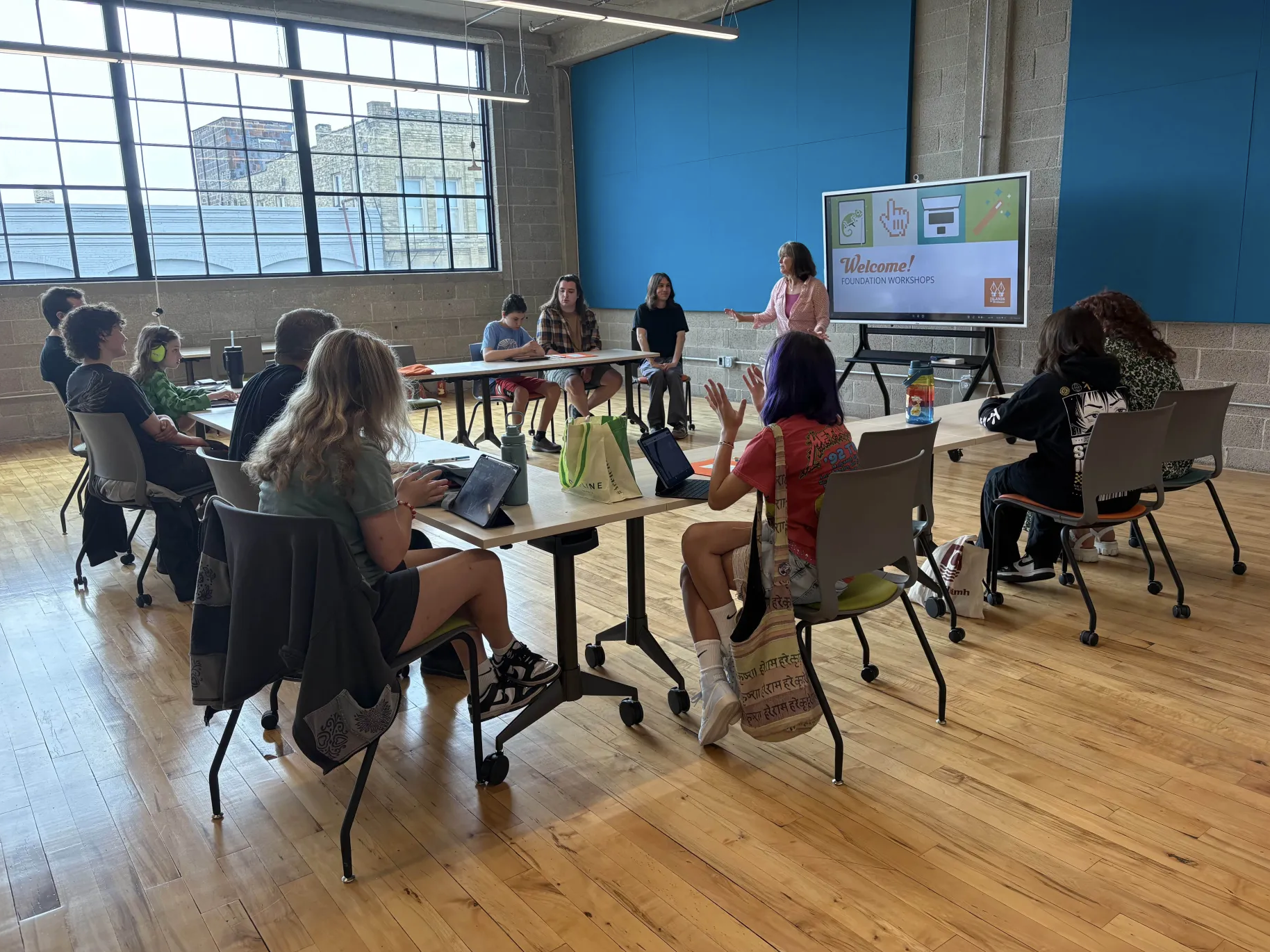 While students are engaged in workshops, parents and caregivers can relax in our comfortable front lounge, connect with other families, or enjoy nearby neighborhood spots. Walker’s Point offers wonderful coffee shops like Vendetta Coffee and Anodyne Coffee, restaurants for every taste, and IOB supporter Indeed Brewing just across the street! They even run a rooftop beer garden in our building that offers incredible views of Milwaukee’s skyline and the Hoan Bridge during the summer months.